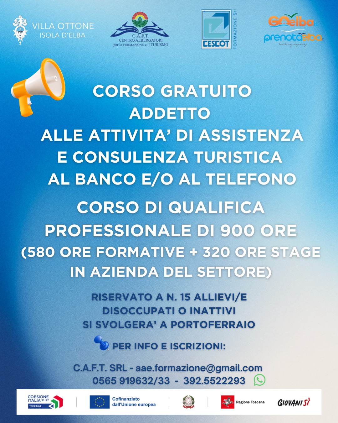 Il corso verrà svolto presso C.A.F.T. srl – Centro Albergatori per la formazione e il turismo srl Piazza Virgilio n. 35 Portoferraio (LI)