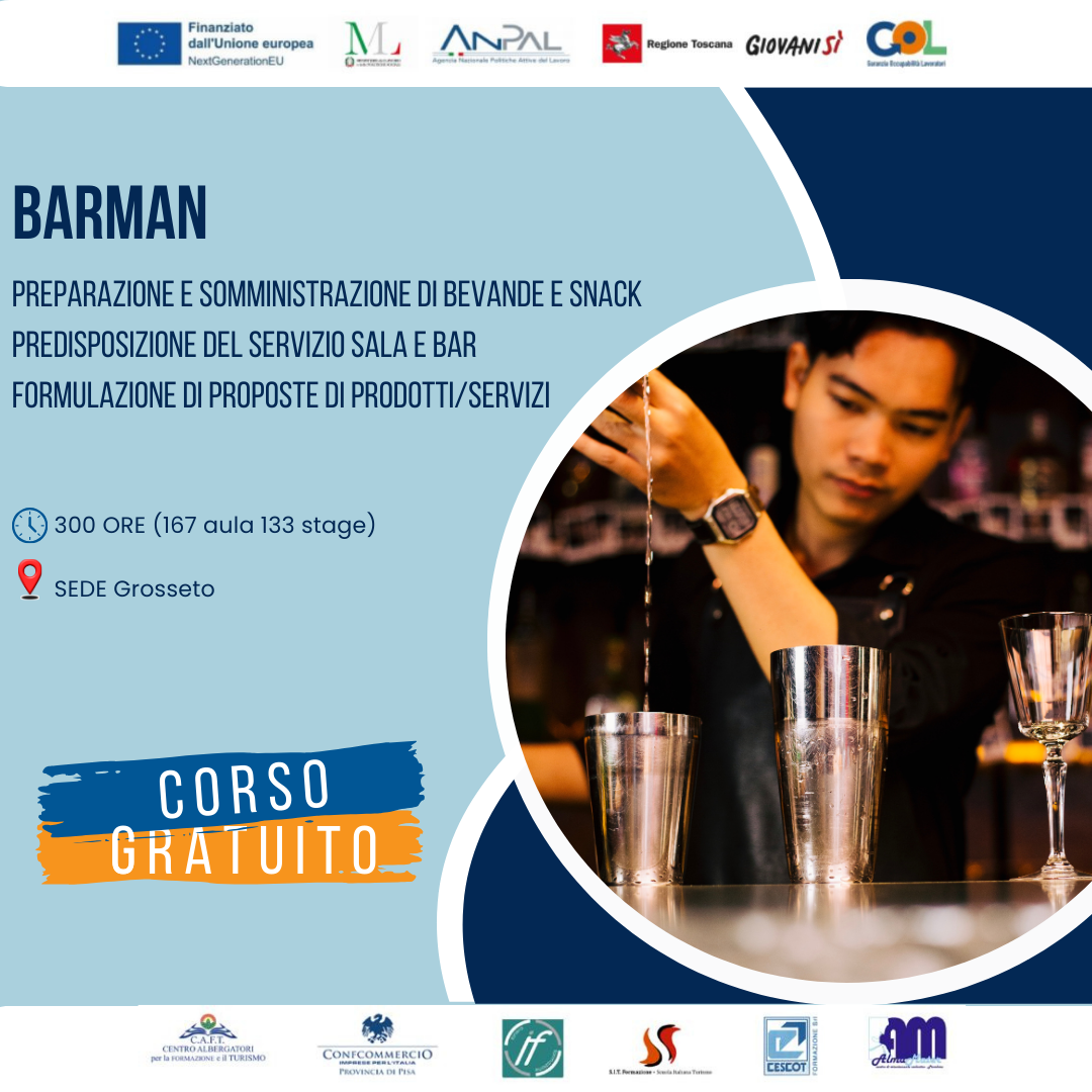 BARMAN – preparazione e somministrazione di bevande e snack, predisposizione del servizio di salae bar, formulazione di proposte di prodotti/servizi